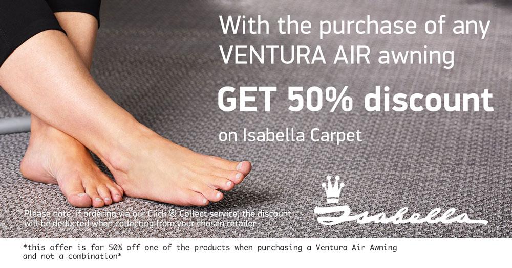 Isabella Carpet is available in three different colourways that perfectly match your Isabella awning. Depth: 250 cm, 300 cm or 350 cm.